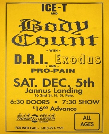Flyer December 5th 1992 St. Petersburg @ Jannus Landing with BODY COUNT, EXODUS & DRI